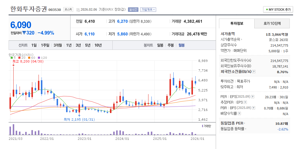 한화투자증권 주요 투자 지표 (2026.02.06 기준)